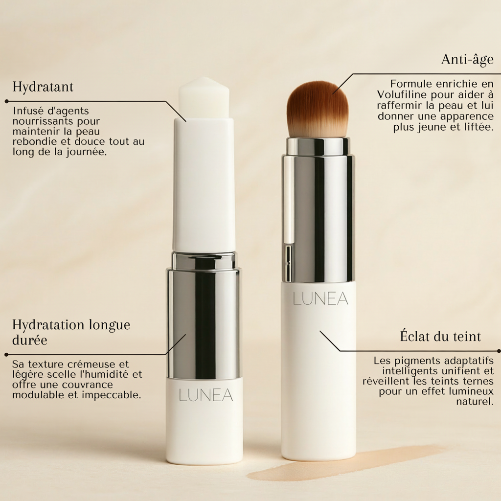 LUNEA utilise une formule réversible unique qui passe de crème à fond de teint. La teinte s’adapte automatiquement à votre carnation tout en offrant hydratation et couvrance.Le stick intègre la technologie Blanc Pact et un pinceau premium de 32 000 fibres allemandes.Enrichi en collagène (22 000 ppm), VOLUFILINE™ et extraits de plantes du désert, il lisse la texture de peau, couvre efficacement les imperfections et apporte un volume naturel.Son effet hydratant et lumineux dure jusqu’à 50 heures.